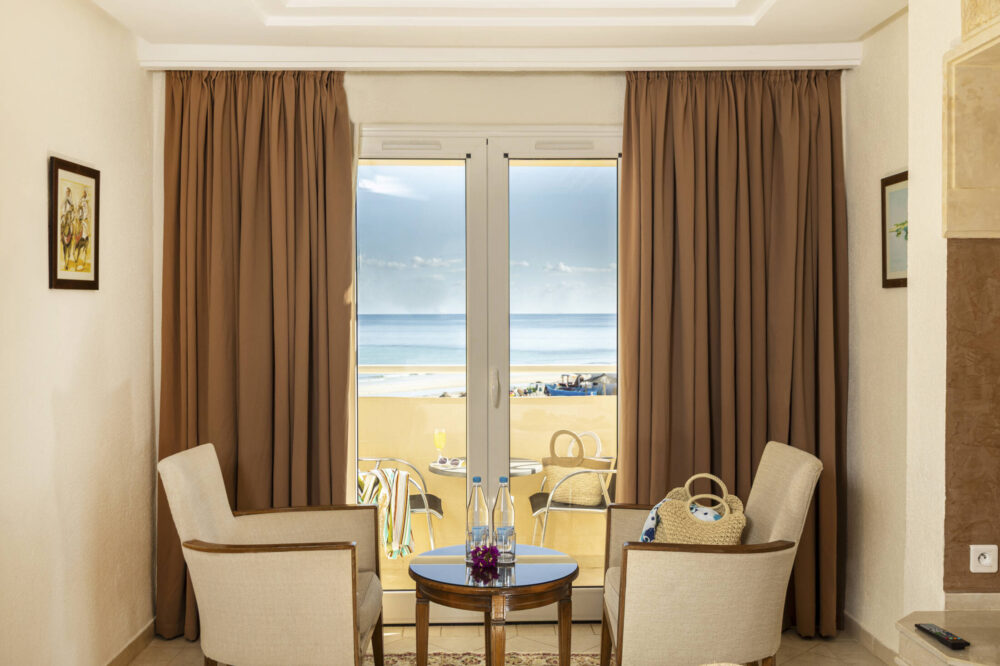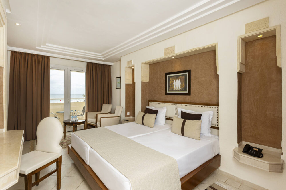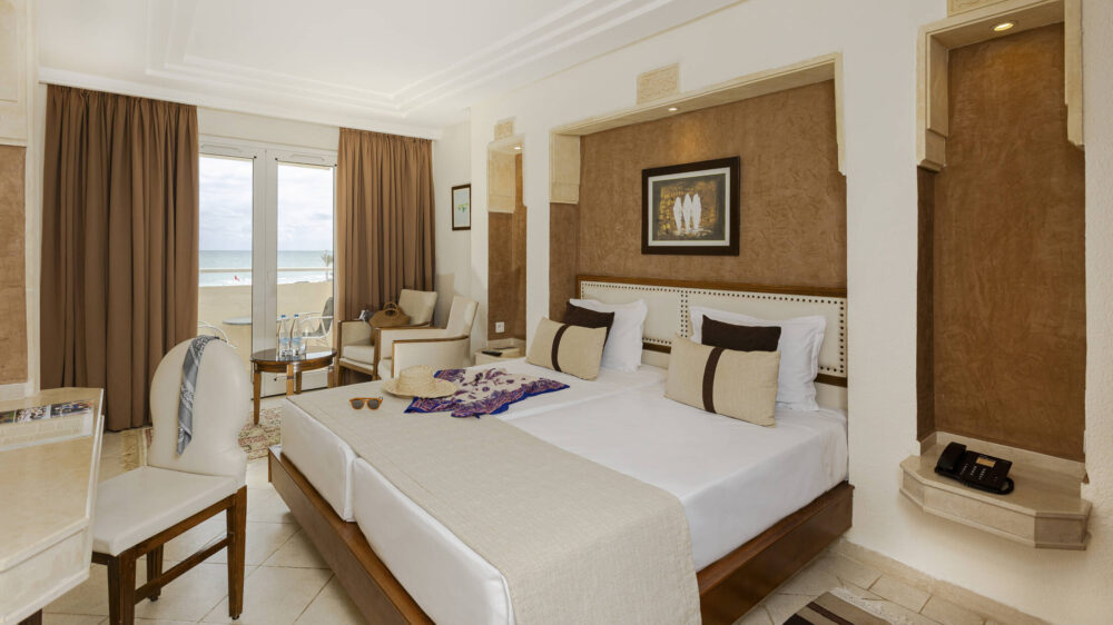Un cocon de tranquillité, alliant literie douillette et décoration élégante pour un séjour en toute simplicité. Pensée pour accueillir de 1 à 3 personnes, notre chambre double à Djerba offre un espace de 22 m² lumineux et reposant. Avec terrasse, balcon ou porte-fenêtre, cette chambre offre un cadre idéal pour se détendre avec vue sur les jardins de l’hôtel. Côté décoration, l’équilibre des couleurs neutres et des textiles soyeux enveloppe la chambre d’un cadre reposant.