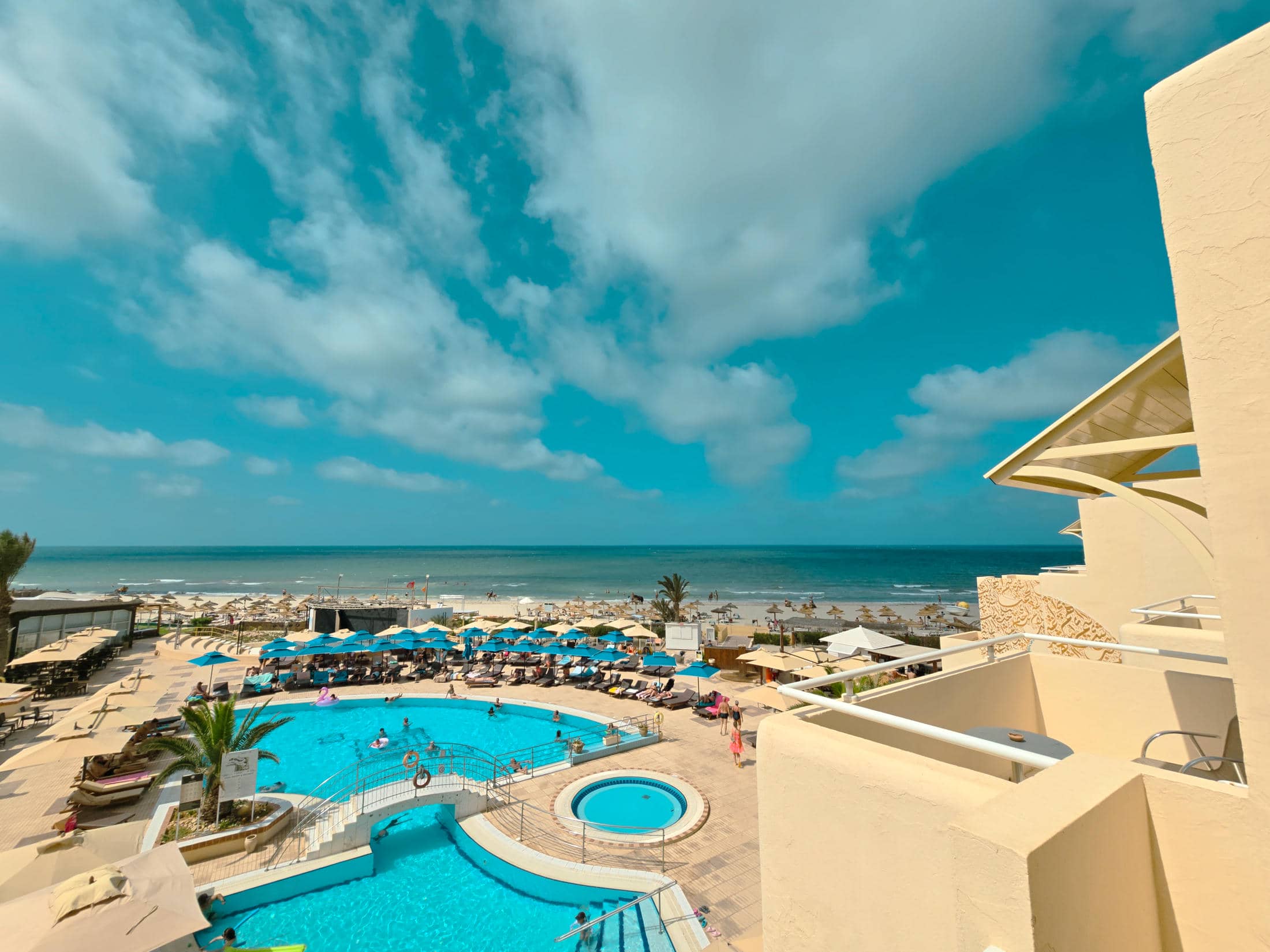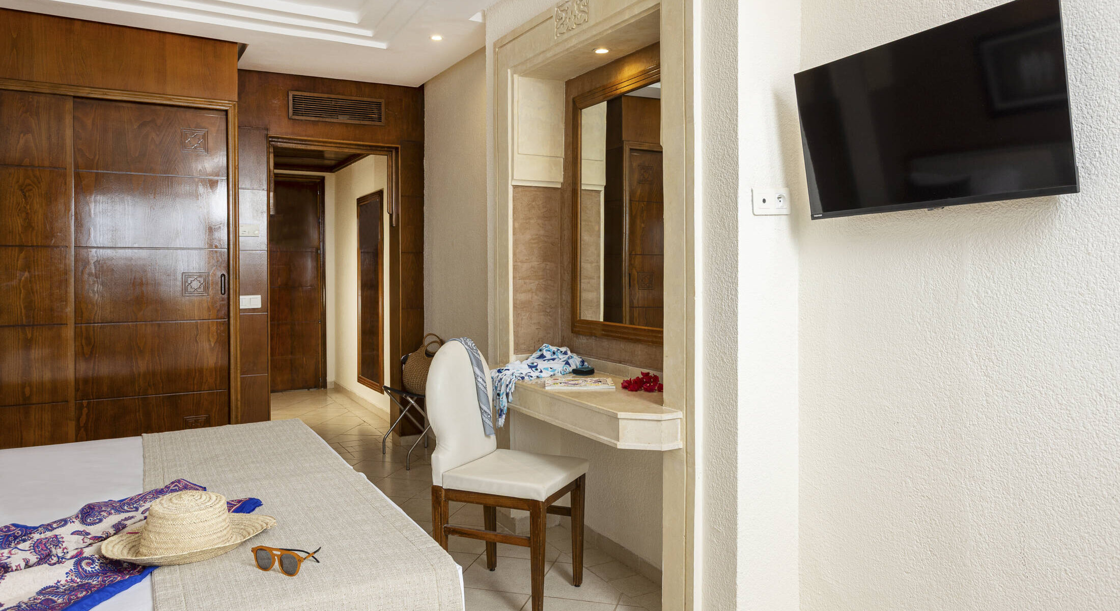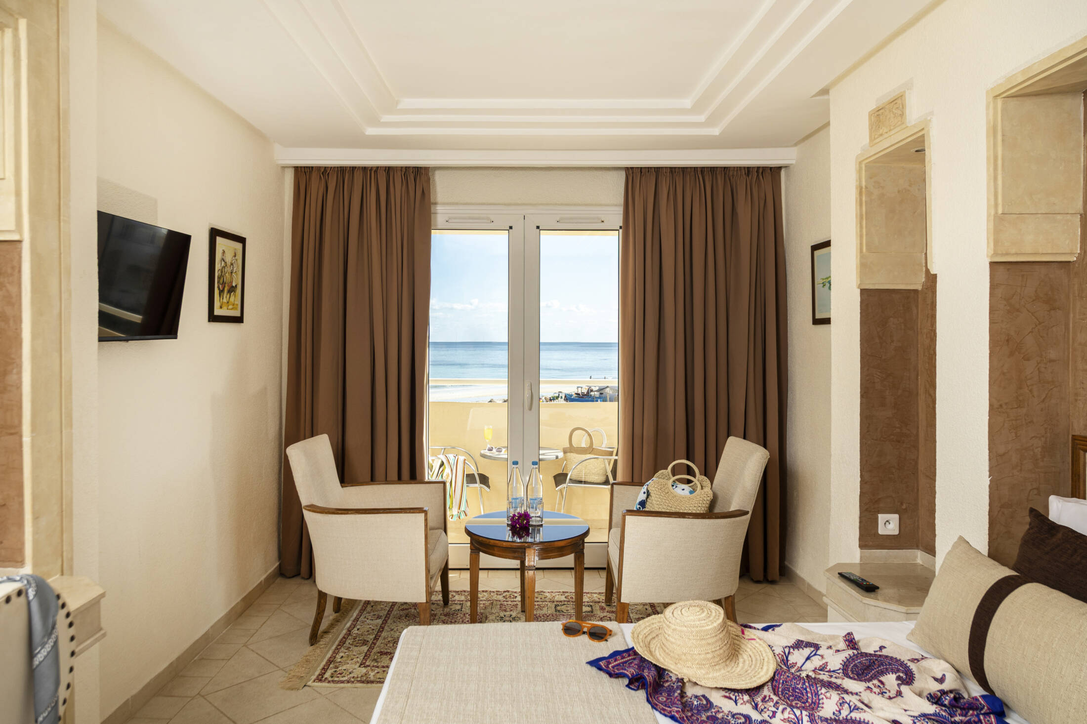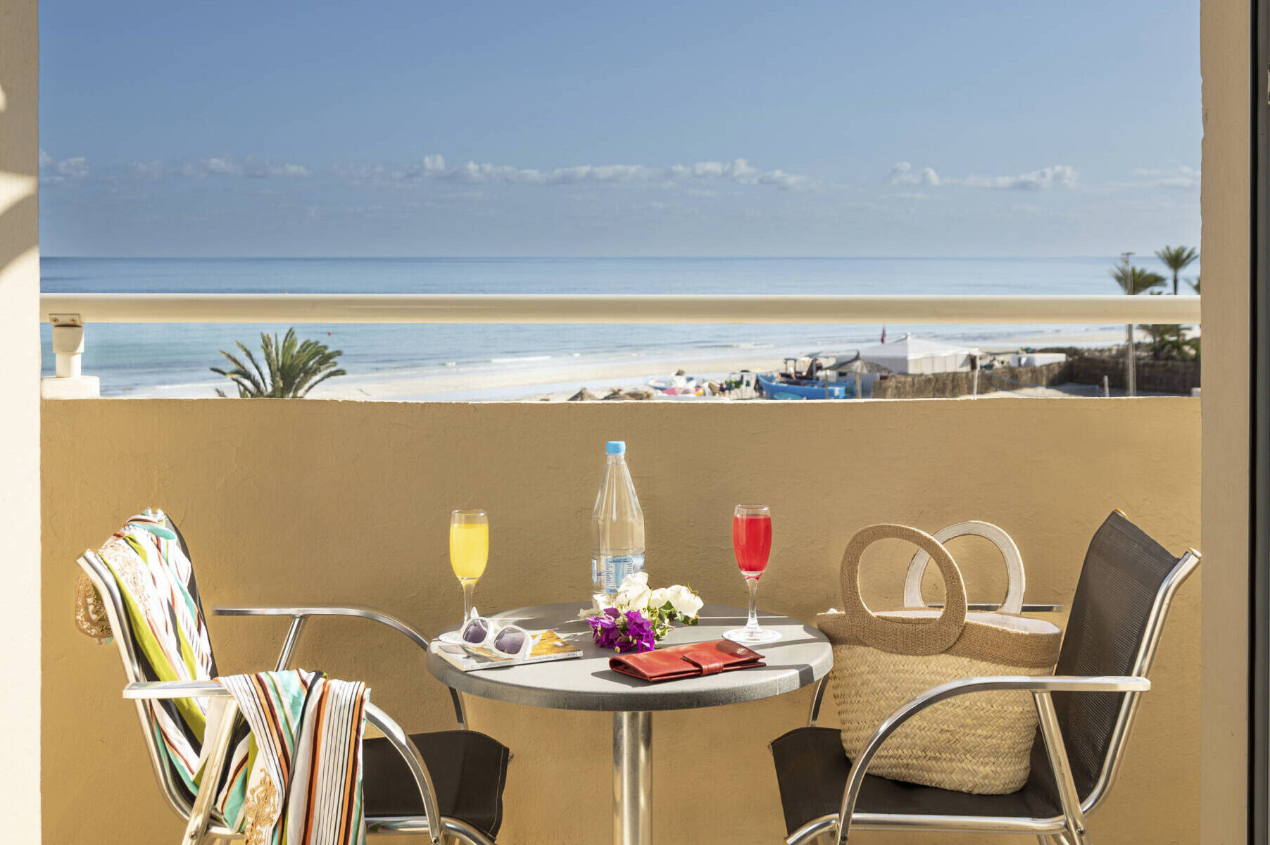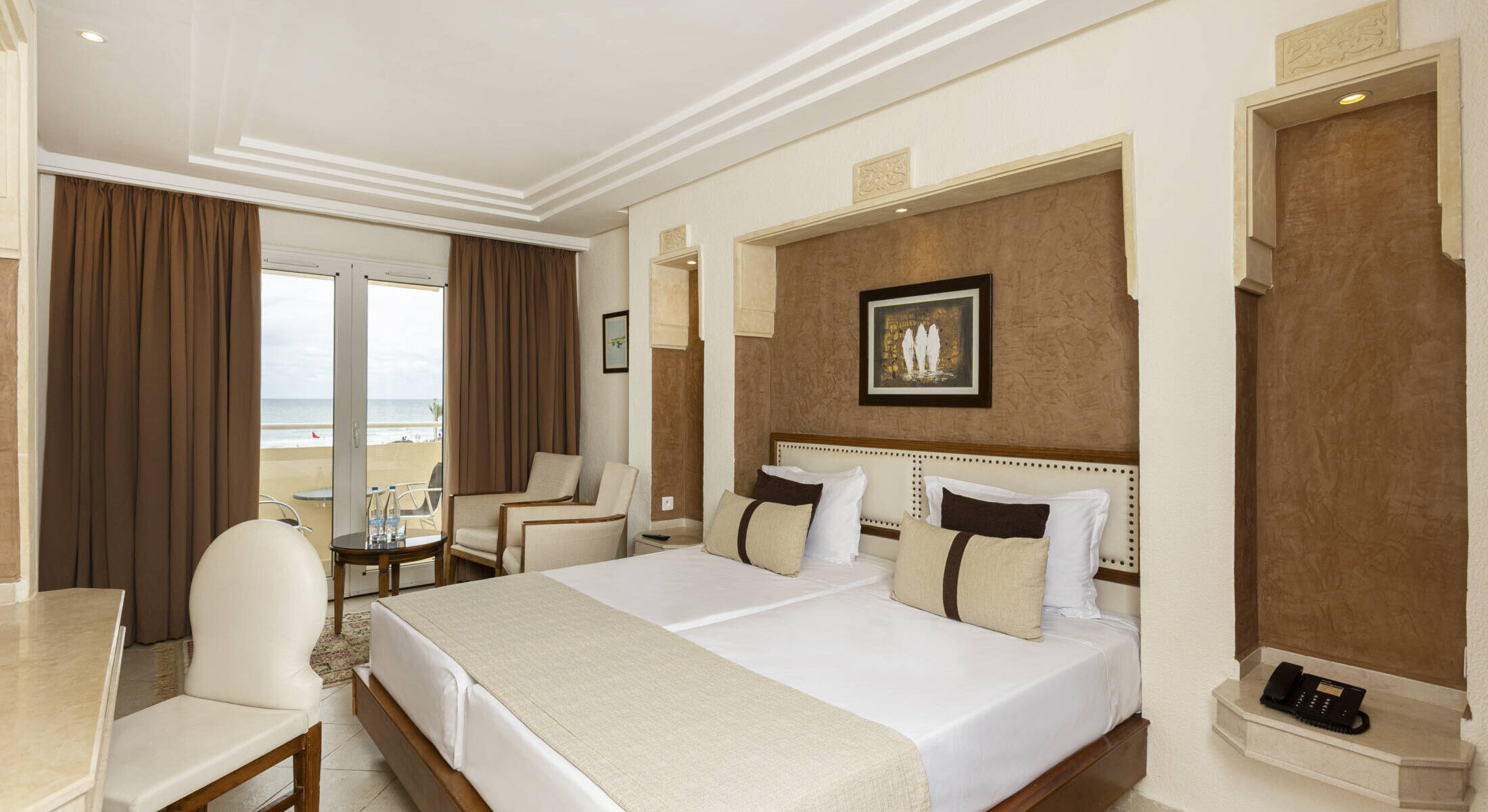 Au sein de notre hôtel à Djerba avec vue mer, la chambre Double Standard Vue Mer a été pensée comme un cadre privilégié pour des moments d’exception. Son agencement de 22 m² est optimisé pour que le panorama maritime soit l’élément central de votre décor. La large ouverture vitrée (porte fenêtre, balcon ou terrasse) estompe la frontière entre l’intérieur et l’extérieur, vous donnant l’impression de flotter au-dessus de l’eau.