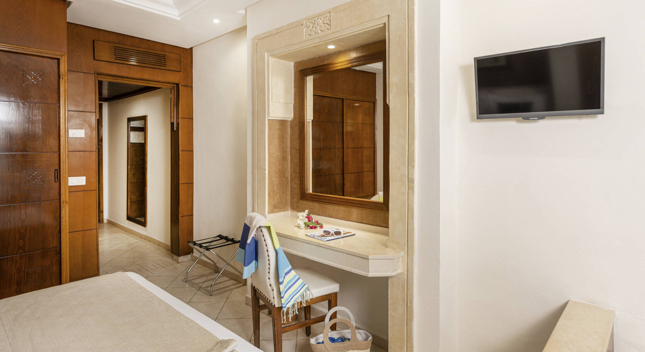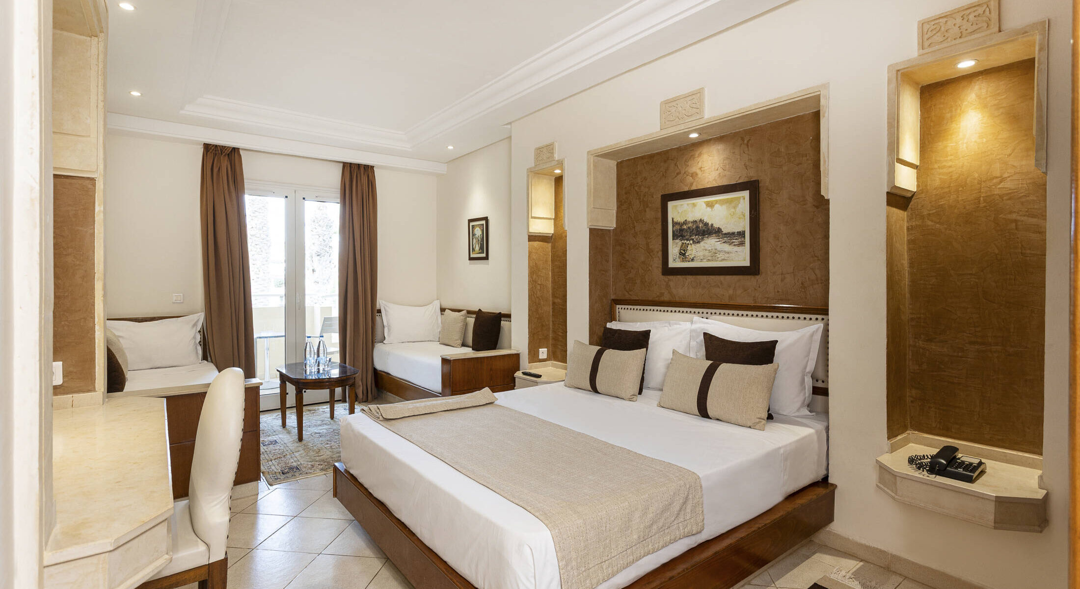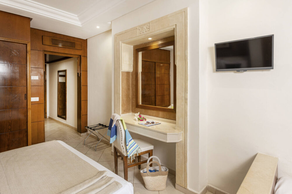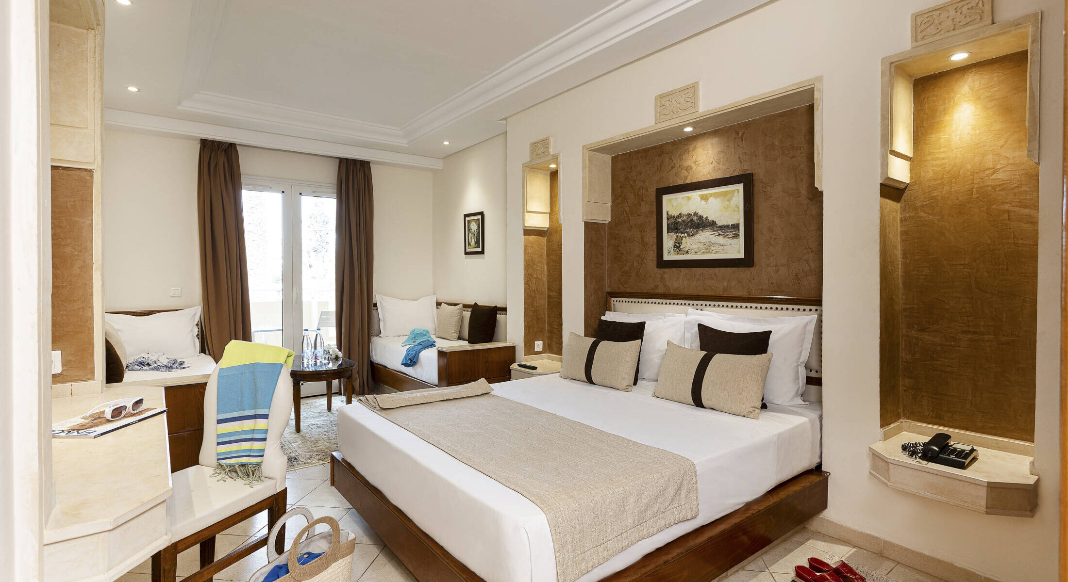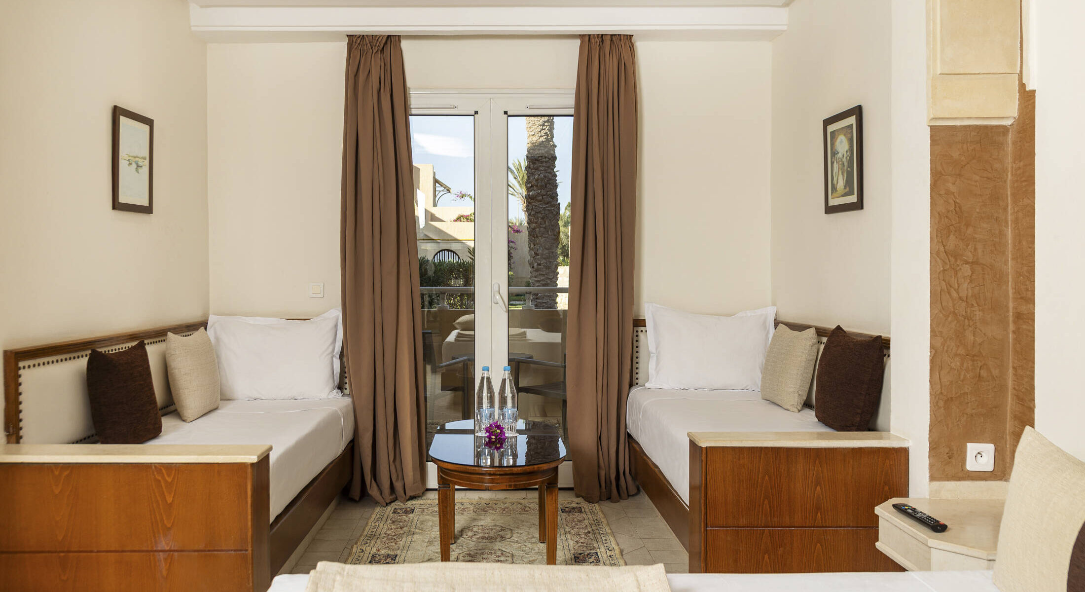 Parce que des vacances en famille réussies commencent par un espace adapté, notre chambre d’hôtel pour famille à Djerba de 30 m² a été pensée pour vous simplifier la vie. Assez vaste pour accueillir 4 personnes, elle offre un volume confortable où les enfants ont de la place pour jouer et où vous pouvez déballer les valises sans vous sentir à l’étroit.