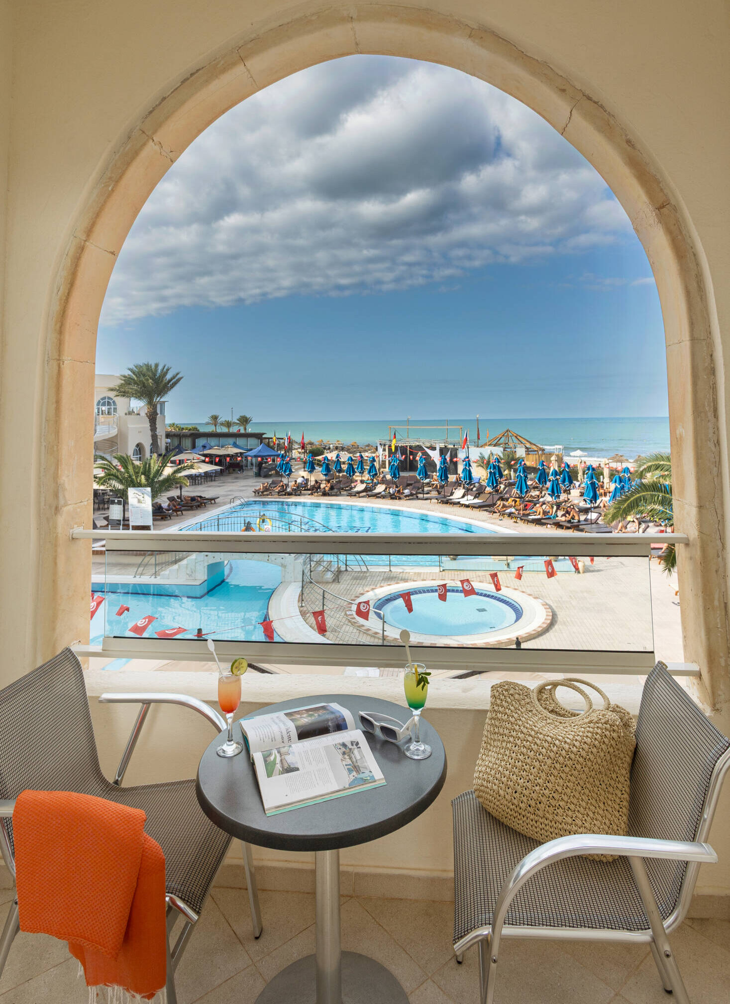 Baignée de lumière, certaines chambres se prolongent harmonieusement par un balcon ou une terrasse privée. Cet espace extérieur deviendra votre refuge personnel pour savourer un café, vous plonger dans un livre ou simplement vous laisser bercer par la douce mélodie des vagues. À la tombée du jour, préparez-vous à un spectacle inoubliable : le ciel de Djerba s’embrase, offrant des couchers de soleil aux couleurs flamboyantes, un souvenir précieux de votre séjour.