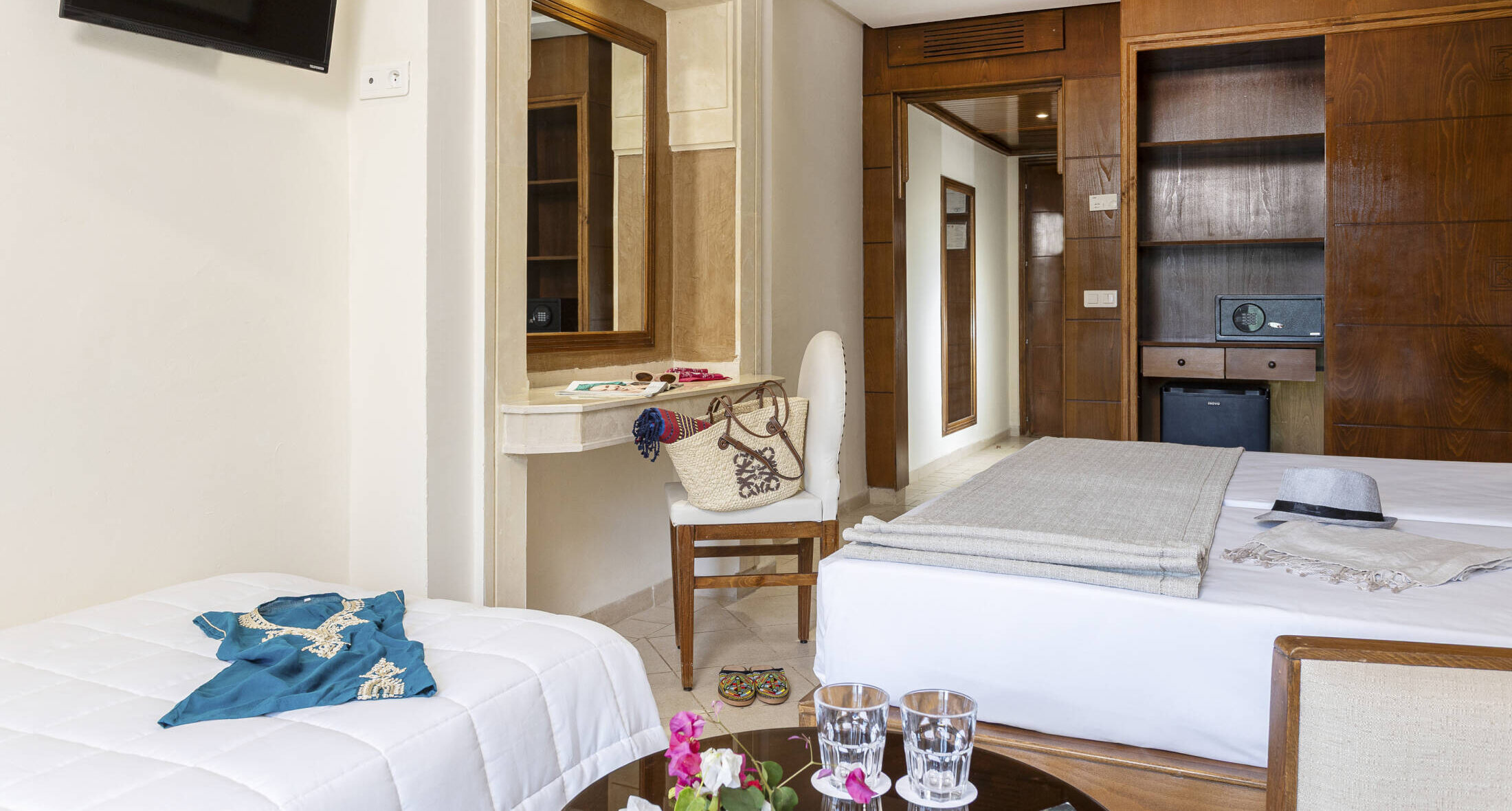 Depuis notre hôtel avec vue sur mer à Djerba, profitez d’une vue exceptionnelle et admirer de magnifiques couchers de soleil. D’une superficie de 22 m², cette chambre triple est idéale pour accueillir jusqu’à 3 personnes.